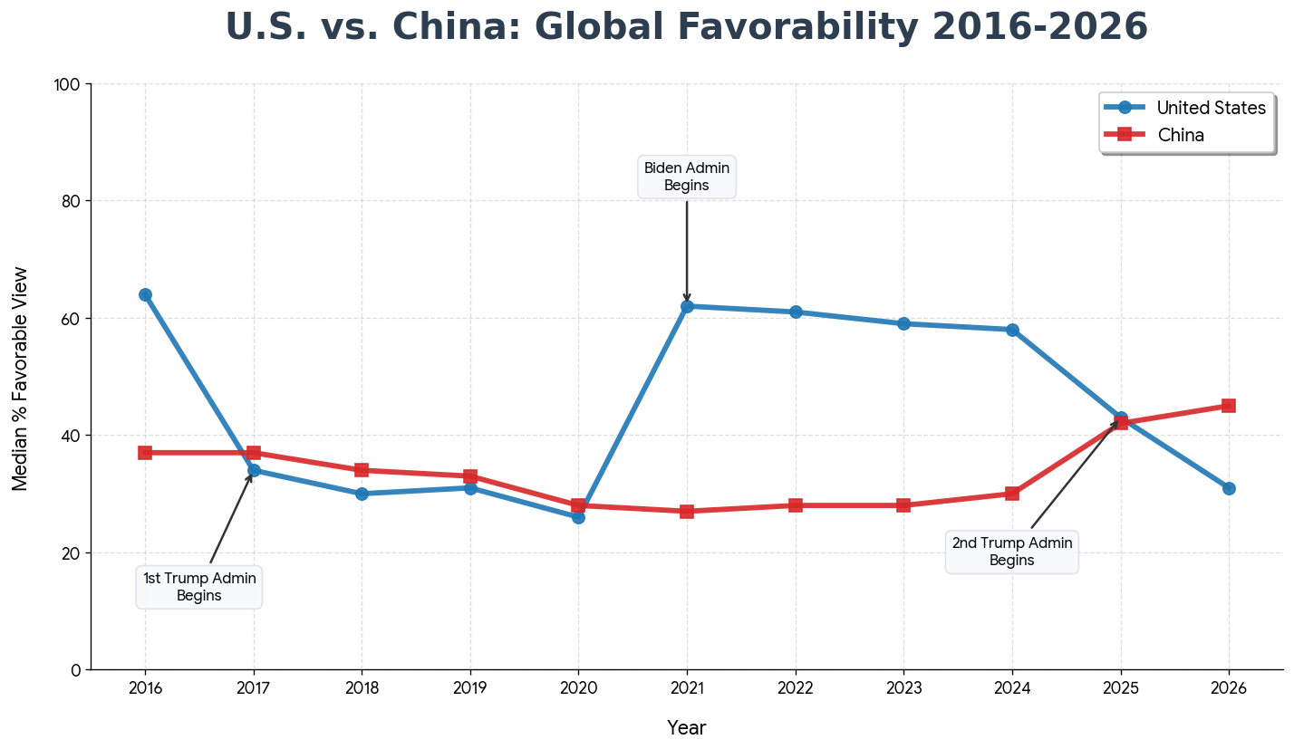By early 2026, China had reached rough parity with the U.S.— a development that would have been unthinkable a decade ago. And now China has pulled ahead. A Morning Consult poll documented China’s net favorability climbing from negative in early 2024 to positive by mid-2025. The U.S. went the other direction.